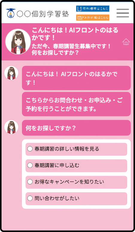 AIフロントは対話式で、お名前、メールアドレスなどを対話式で聞いていくので、お客様も安心してお申し込みいただけます。